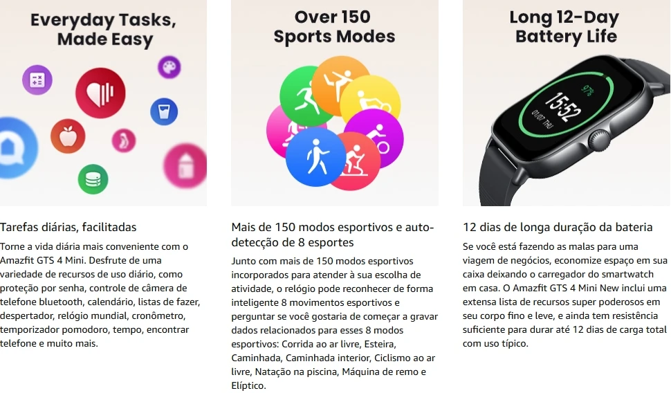 Um parceiro de fitness com mais de 150 modos desportivos: quer seja um jogador de equipa ou prefira o foco de treino sozinho, o relógio desportivo Amazfit GTS 4 Mini New é o derradeiro smartwatch desportivo fácil de usar. Com mais de 150 modos esportivos integrados para atender à sua escolha de atividade, o relógio pode rastrear métricas como frequência cardíaca