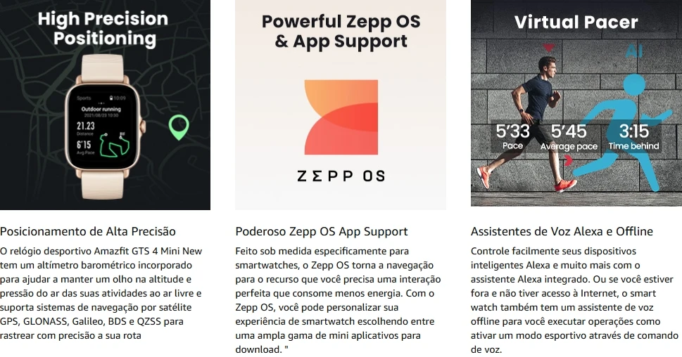Alexa e Assistente Offline: Defina facilmente um alarme, faça uma pergunta, obtenha uma tradução e muito mais com o Alexa, que está integrado no Amazfit GTS 4 Mini Novo relógio inteligente. Se você está fora e não tem acesso à Internet, o smartwatch também tem um assistente de